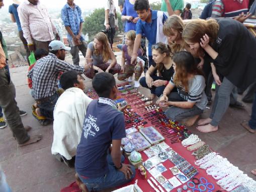 Anschließend ging es zur Lunch-Time wieder ins Hotel zurück. Das Essen im Hotel schmeckte auch tatsächlich relativ gut. Nach einer kurzen Mittagspause sollte es dann eigentlich in in eine Färberei und Textildruckerei gehen. Dieser Programmpunkt wurde kurzerhand verschoben und durch einen anstrengenden Bummel durch ausgewählte "sichere" Geschäfte im indischen Stil ersetzt. Interessierte wirklich niemanden von uns. Nun sollte es aber wirklich in die Färberei gehen. Fehlanzeige. Wegen eines politischen Treffens war die Innenstadt gesperrt und unser Bus musste eine Umleitung fahren. Wieder Fehlanzeige, der Bus passte nicht unter der Brücke der Umleitung durch. Färberei gestrichen! Programmänderung: Shoppingmall in der Peripherie. Die war zwar ungewohnt sauber und modern, aber dafür erstaunlich leer! Man fühlte sich irgendwie einsam in diesem Komplex. Trotz verlockender Angebote (originale Levis Jeans für 36€) blieben die meisten bei Gewürzen, Süßigkeiten und Subway... Gegen halb 7 fuhren wir dann zum Abenteueressen, wiederum etwas abseits von Jaipur! Uns begrüßte ein kleiner Erlebnispark bestehend aus kulturellen Attraktionen, die für die Region Rajasthan typisch sind: Kamelreiten, indisches Kasperletheater, Bauchtanz, "Riesenrad" und ohrenbetäbender Bollywood-Disco – durchaus ein Erlebnis, wie die gesamte Indien-Reise sowieso. Zwischendurch löffelten wir Tomatensuppe aus Tongefäßen und probierten kleine indische Spezialitäten, um am Ende des lustigen Rundganges das eigentliche Dinner zu genießen. Eingeladen zu diesem Spektakel wurden wir von einem Elternpaar, das bereits einen Sohn auf der Scindia School hat und den zweiten dort unterbringen möchte. Mit vollen Mägen und müden Augen bestiegen wir den Bus für die Rückfahrt zum Hotel, wo wir gegen 23 Uhr, nach einem ziemlich langen Tag eintrafen und einige vom Hoteldach aus noch einen letzten Blick über die Stadt warfen. Gute Nacht Jaipur!