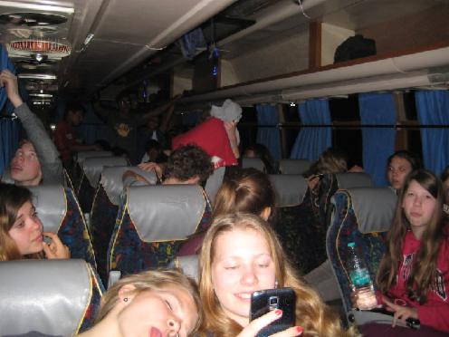 Der Rest des Tages verlief einseitig -13 Uhr bis 24 Uhr Fahrt mit dem Bus (diesmal wirklich) zurück. Hier eine kurze Zusammenfassung der Ereignisse: - Musik hören, schlafen, Pinkelpausen, Kekse essen, Bus wechseln, Busfahrer wird für ca. 10 Minuten ohne Erklärung von der Polizei mitgenommen - kam aber bald wieder und fuhr weiter als wäre nichts gewesen. Ja, dieser Punkt ist kein Witz. McDonald’s Stopp für Abendessen und endlich die Ankunft. Müde gingen wir ins Mädchenschlafzimmer, wo die letzte oder war es die erste Überraschung des Tages auf uns wartete : eine Gruppe lauter aus unserer Sicht rücksichtsloser !!! Inderinnen waren für eine Nacht mit uns ins Zimmer gepackt worden. Aber eigentlich ist das dann auch egal gewesen, wir waren müde und wollten nur noch schlafen...