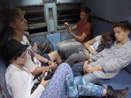 Der heutige Tag soll uns endlich zu unseren Austauschpartnern nach Gwalior bringen. Alles war gut geplant. Die Tickets hatten wir bereits seit Monaten. Das Hotel war extra in Nähe des Bahnhofs gebucht worden, um schnell und pünktlich am Zug zu sein mit unserem schweren Gepäck. Ausgeschlafen packen wir unsere Siebensachen zusammen und warten auf das Signal des Aufbruches. Wider Erwarten ereilt uns die Nachricht, dass unser Zug gestrichen sei. Auf den Gesichtern unserer Lehrer macht sich Panik breit. Sie stehen an der Rezeption und belagern das Telefon. Wir richten uns in der Lobby des Hotels ein. Im 10-Minuten-Takt ändern sich die Ansagen: