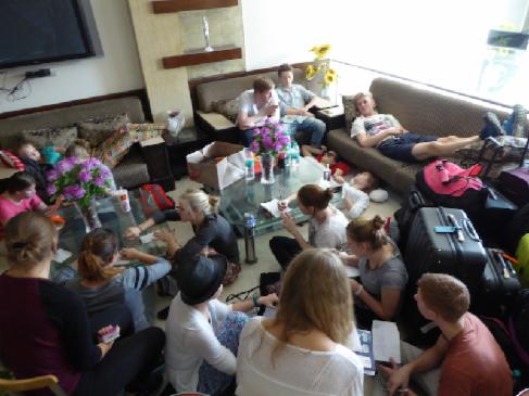 Der Tag ging für uns schon sehr früh los. Pünktlich um 5 Uhr morgens fanden wir uns auf dem Flughafen Tegel ein. Die Sorge, unsere Koffer hätten Übergewicht, hat sich zum Glück nicht bestätigt. In den 8 ½ Stunden reiner Flugzeit war das Essen so ziemlich das Beste. Als wir dann gegen Mitternacht indischer Zeit gelandet waren, waren wir sehr geschafft, aber überglücklich, endlich da zu sein. Wir hatten das „Glück“, die indische Pünktlichkeit kennen lernen zu dürfen. Das heißt, wir haben 3 ½ Stunden auf den Bus gewartet, der uns zu unserem Übergangshotel bringen sollte. Beim Verlassen des Flughafens haben wir uns von einer großen Menschenmenge beobachtet oder besser angestarrt gefühlt. Während der langen Zeit, die wir gewartet haben, gewöhnte man sich langsam daran. Es war ein unwohles, aber trotzdem cooles Gefühl. Die Nacht war sehr kurz.