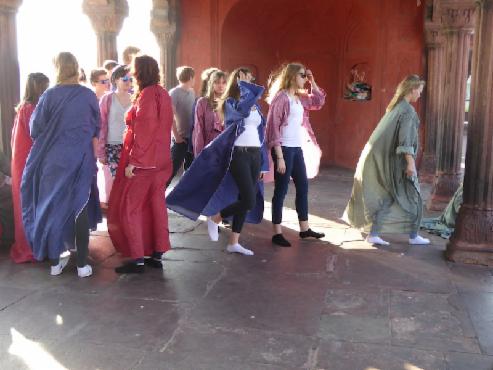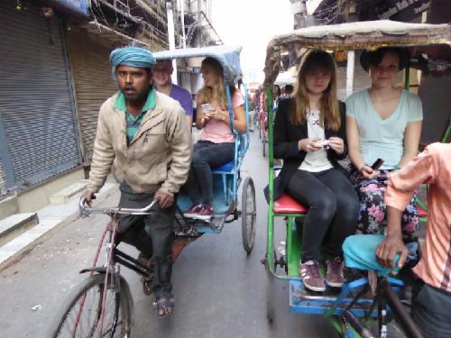 Um zu unserem nächsten Ziel, dem Red Fort, zu gelangen, mussten wir unseren konfortablen Touribus stehen lassen und kämpften uns stattdessen zu Fuß durch abenteuerliche enge, stinkende Gassen, wo junge Männer ihre Morgenwäsche vollzogen, Affen gefüttert und vielfältige, für uns oft seltsame Stände, aufgebaut wurden. Bald stiegen wir zu zweit auf das wohl traditionellste indische Transportmittel um. Nicht minder abenteuerlich ging es nun per Rikscha weiter durch Alt Delhi, und nicht nur einer stieg aus diesem Gefährt mit blauen Flecken und Beulen aus. Nach der Tour durch die engen Gassen, wirkte dieses Bauwerk aus rotem Sandstein gigantisch auf uns und wir genossen es durch die großzügige Anlage zu schlendern, nicht zuletzt auch deshalb, weil es einige kleine Läden zum Shoppen gab.